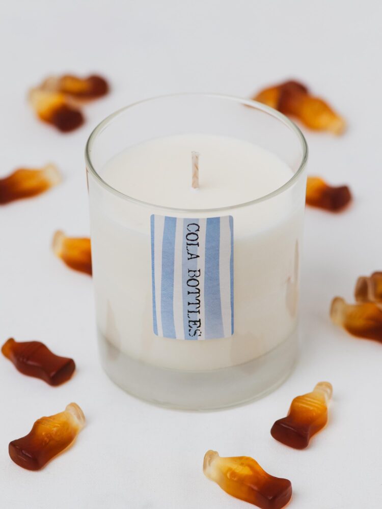 Cola bottle scented candle with soy wax. Sweets can instantly transport us back to childhood and staring wide eyed up at the rows of sweet jars in the corner shop. Was a school trip even a school trip without a paper bag filled with Cola bottles on the coach?