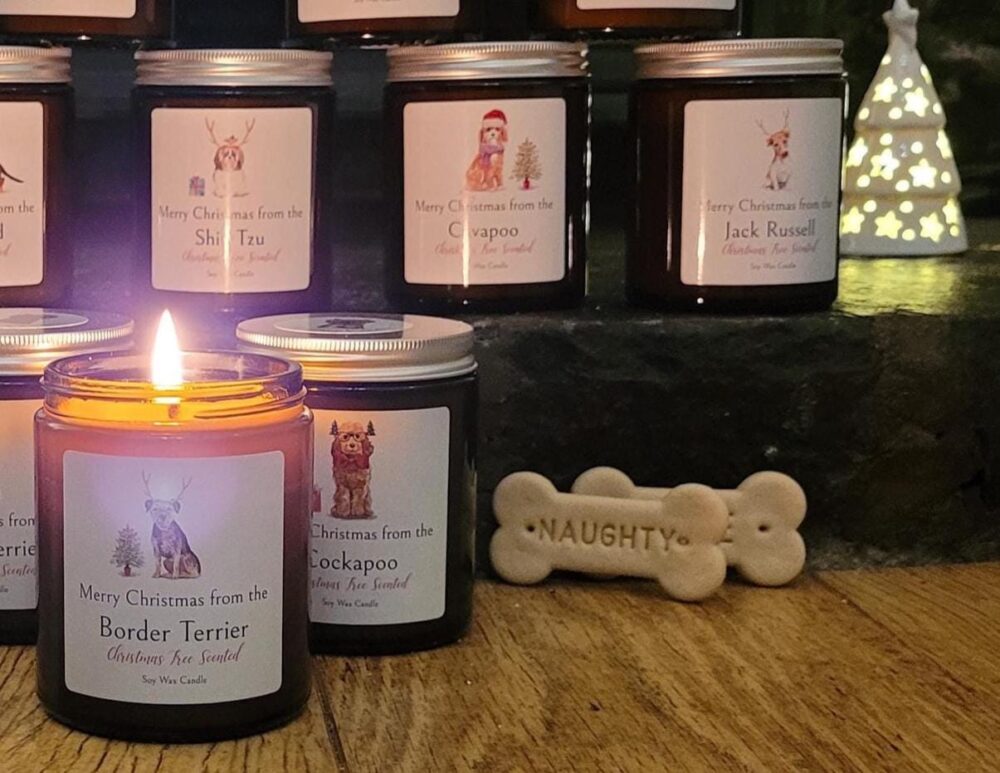 The Border Terrier is a popular dog for good reason. They are definitely a big dog in a small dogs body. Known for their stubborn nature they are also loving and keen to please their humans. They will love the excuse to spread as far across the settee as they can while sniffing the scent of fresh Christmas trees. All our oils are made in the UK and are vegan and dog friendly. We only use eco friendly soy wax too.